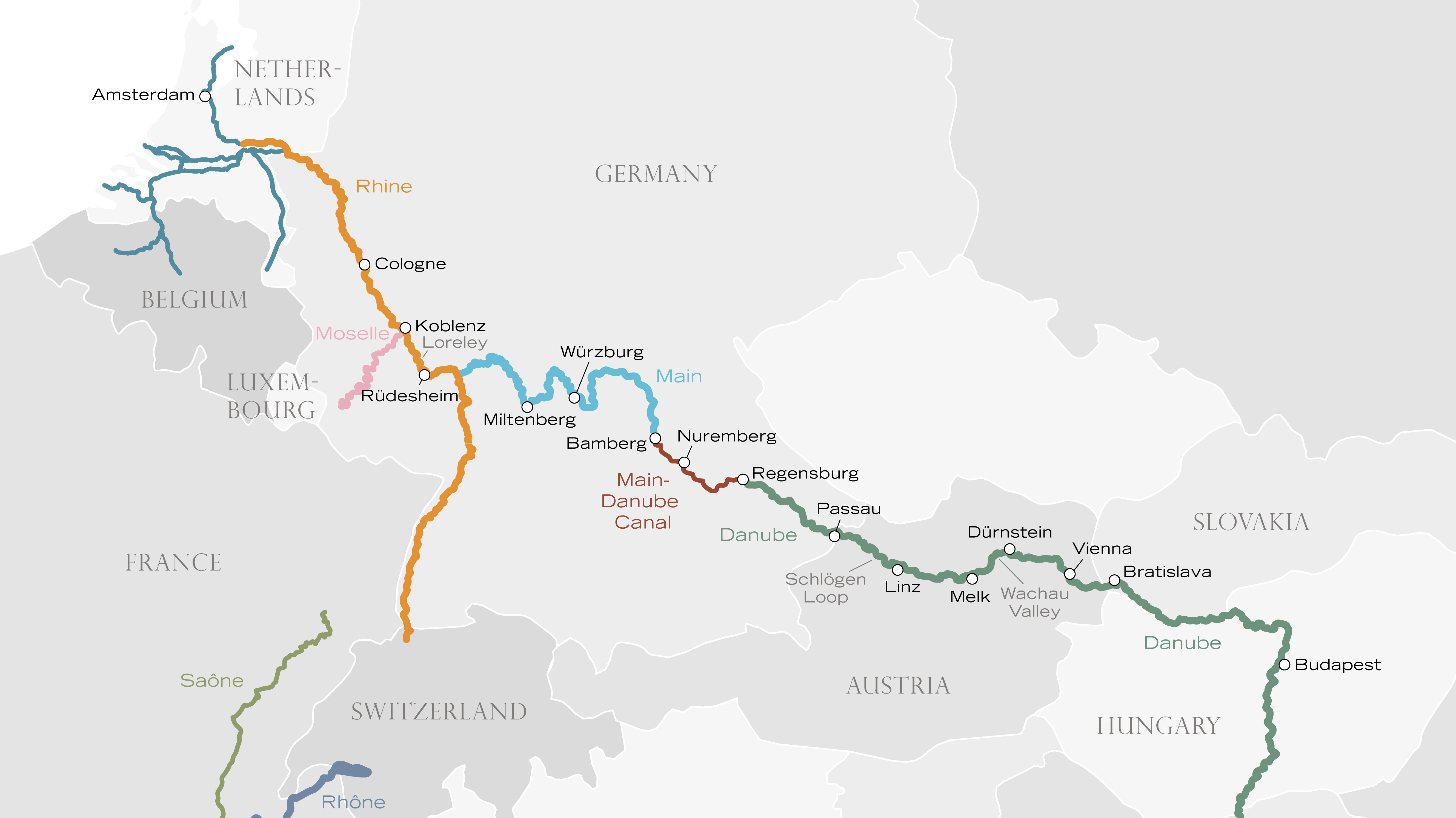 Cruise south to north during two splendid weeks, from Hungary all the way to the Netherlands! Embark on the mighty Danube, visiting three amazing capitals: Budapest, Bratislava, and Vienna! It just doesn’t get any grander as you investigate the rich histories and traditions of these very different cities. Heading upriver, true wonders await, like Europe`s largest pipe organ in Passau, the world’s oldest restaurant in Regensburg, and Bamberg’s unusual “smoked beer”. Travel along the Main River, which seamlessly leads you onto the Romantic Rhine. Here, world-class wines and fairytale charm await in Rüdesheim before Mother Nature takes center stage in the awe-inspiring Rhine Gorge. The journey concludes with time in elegant Cologne and Amsterdam, the stunning Venice of the North!