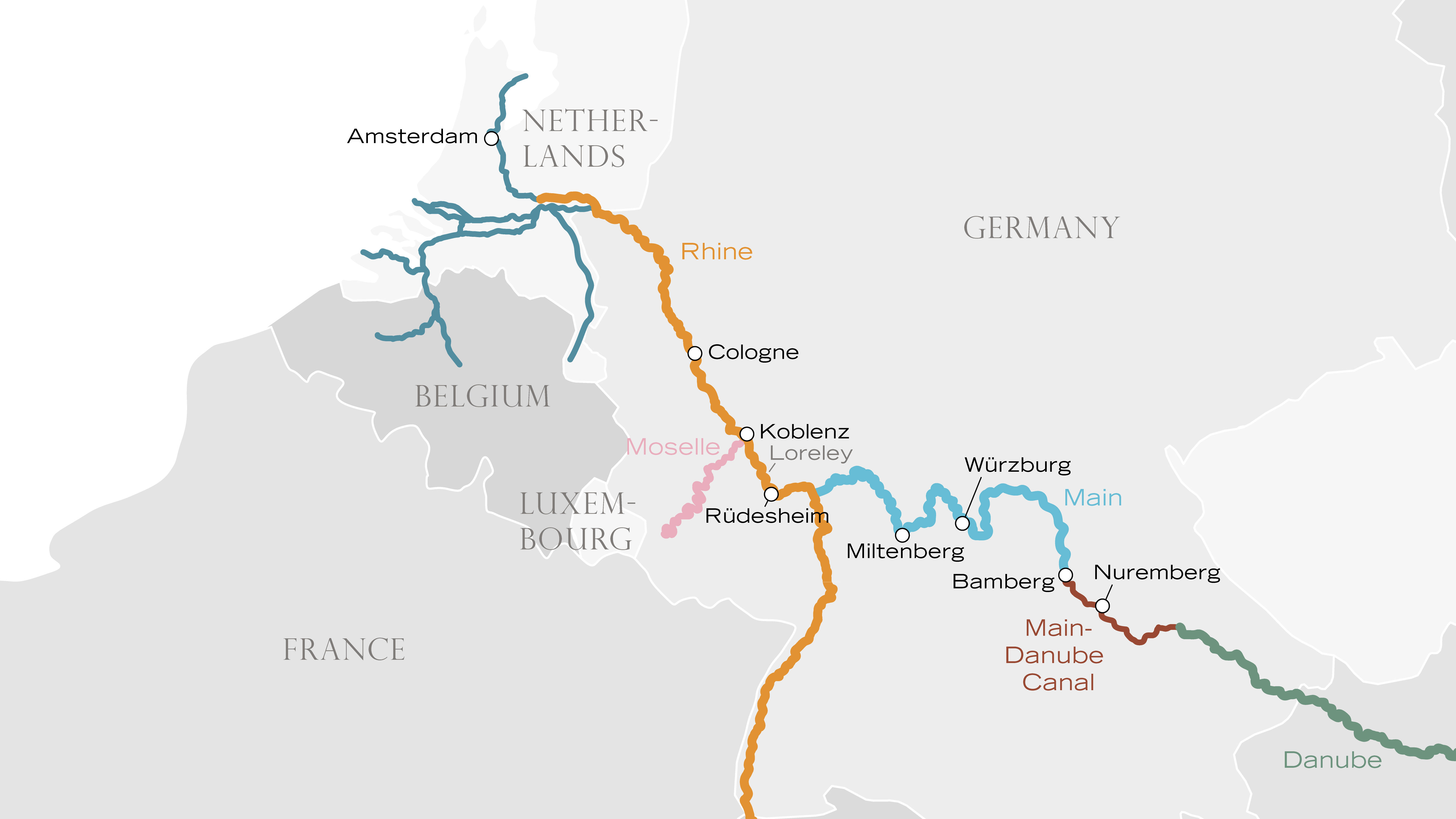 Culture, nature, sights, cuisine—this week-long exploration along the Main and Rhine Rivers has it all! Embark in stately Nuremberg, and immediately start your discoveries…like Bamberg’s unusual “smoked beer” and middle-of-the-river Town Hall. Würzburg comes next with its unrivaled palace and fortress, followed by time in Bavarian Miltenberg, home to one of Germany’s oldest inns and around 150 half-timbered houses. Rüdesheim introduces you to life in a charming riverside wine village before Mother Nature takes center stage in the awe-inspiring Rhine Gorge. In Cologne, you have the chance to experience the city in traditional ways or by virtual reality technology and Amsterdam with its intricate network of canals will leave you with a lasting impression!